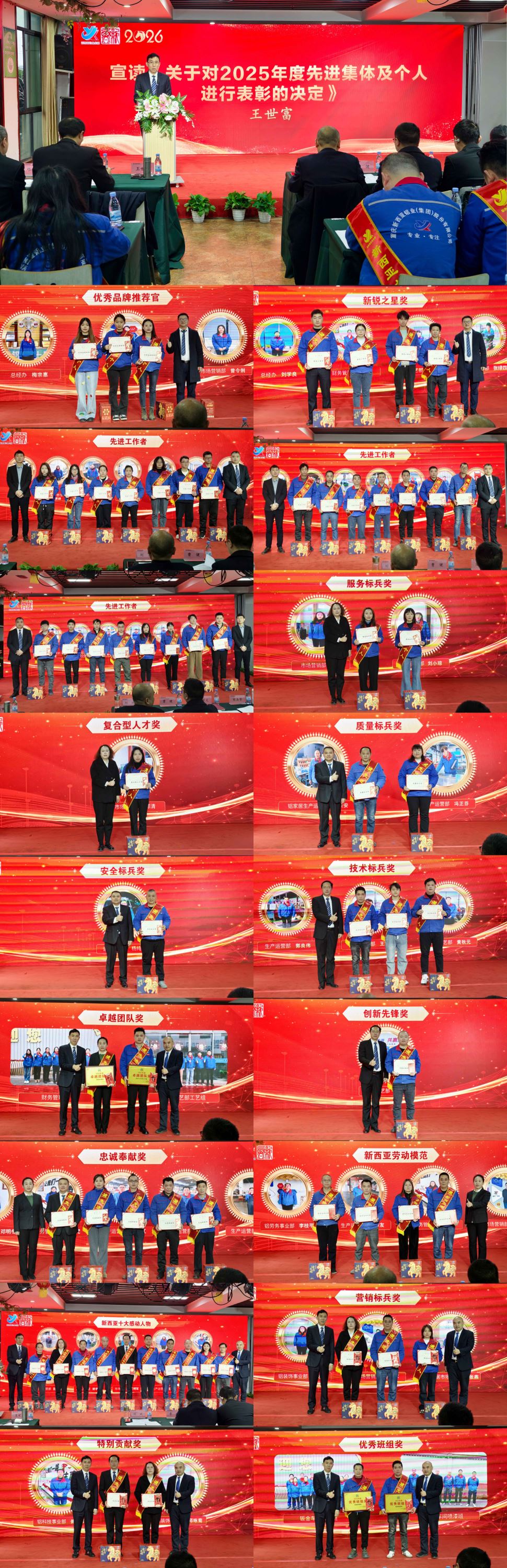 大会对2025年度涌现出的先进集体和个人进行了隆重表彰。宣读了《关于表彰2025年度先进集体及先进个人的决定》,并向卓越团队奖、优秀班组奖、新西亚十大感动人物、劳动模范及各类标兵获得者颁发了荣誉奖项。